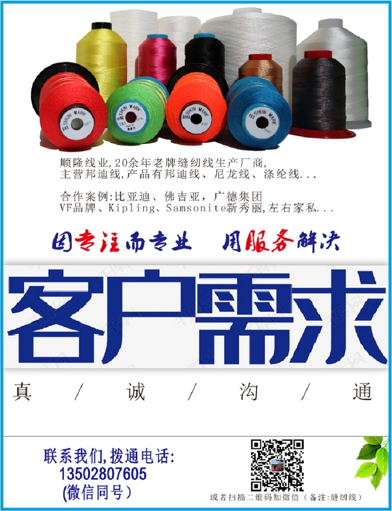 深圳市順隆線業有限公司,位于深圳市龍崗區(qū)坪地街(jiē)道(dào)中心路4-2号,公司創辦于1997年,主打産品為(wèi)邦迪線。主營尼龍邦迪線、滌綸高(gāo)強邦迪線,尼龍邦迪線,錦綸線、高(gāo)強線、滌綸線等。我司為(wèi)撚線、染整、成型一條龍生(shēng)産和(hé)直銷型企業,多(duō)年來(lái)為(wèi)比亞迪、新秀麗(lì)、VF、小(xiǎo)米、左右家(jiā)私等知名企業提供優質縫紉線,本着質量第一、以誠為(wèi)本、誠實守信的工作(zuò)方針,竭誠歡迎廣大(dà)新老客戶前來(lái)談。