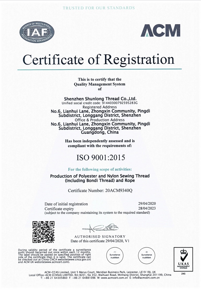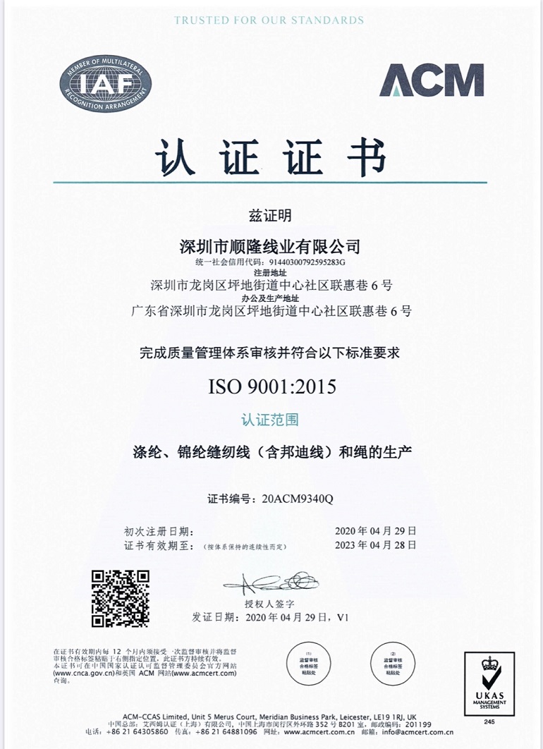 順隆線業 在2020年4月份通(tōng)過新版ISO體(tǐ)系管理(lǐ)認證,并獲得(de)證書(shū)