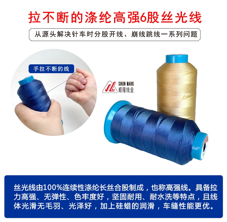 滌綸長絲縫紉線的特點:線質柔軟,表面光滑無毛羽,染色溫度130攝氏度,色牢度好,滌綸纖維拉長比适中大(dà)概8-12%,長絲縫紉線拉力強度好,延伸率低(dī),加上(shàng)道(dào)康甯矽油的潤滑,針車(chē)實用性較強。