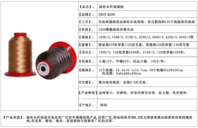 特品線的應用:特品線是滌綸長纖維縫紉線中的高(gāo)端縫紉線産品,采用的是8克旦長絲原材料,加上(shàng)單線定型及高(gāo)效潤滑,能适用于較厚、較硬的真皮制(zhì)品制(zhì)作(zuò)的縫紉,車(chē)縫順暢、線迹美觀,能提高(gāo)成品的外觀及檔次!