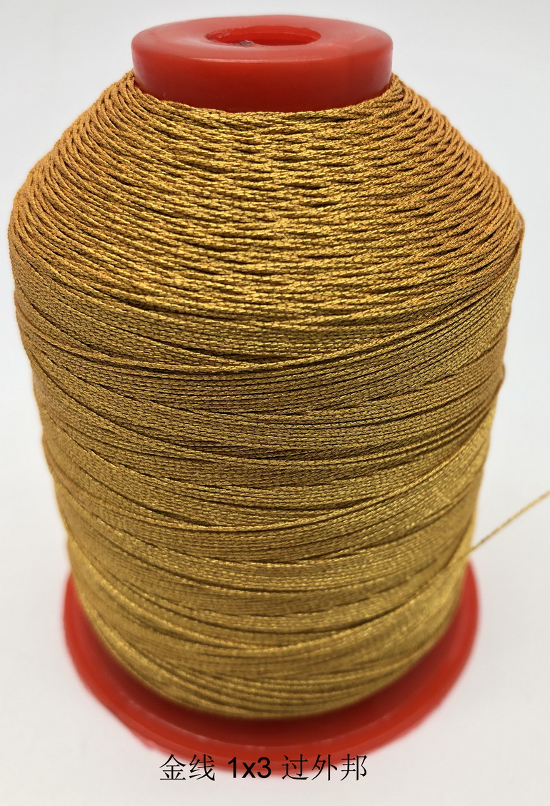 金蔥線工藝:滌綸長纖維化纖撚線過程中,加入金色或銀色單絲一起撚線制(zhì)成,或用用單股繡花(huā)線并股合撚而成;