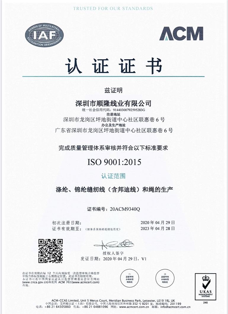 【 深圳市順隆線業有限公司】:20多(duō)年專注生(shēng)産邦迪縫紉線自設撚紗染色交貨快品種規格多(duō)可(kě)提供環保報告源頭工廠質量保證質量問題可(kě)退貨足稱足碼價格優惠撚線染色成型配送一條龍服務。公司現擁有(yǒu)标準廠房(fáng)5000多(duō)平方米,員工一百多(duō)人(rén),年生(shēng)産能力1500多(duō)噸。本着“和(hé)諧、創新、勤儉、立質、立信”的企業核心價值觀理(lǐ)念,深圳市順隆線業有限公司立志(zhì)要成為(wèi)廣東制(zhì)線行(xíng)業中的領頭羊之一。目前合作(zuò)的知名企業如:比亞迪汽車(chē)、宏盛皮具、左右家(jiā)具等,合作(zuò)的品牌有(yǒu)NIKE、VF、KIPING、RED APPLE等。經過多(duō)年的産品及技(jì)術(shù)創新,已形成一套嚴格的縫紉線生(shēng)産和(hé)管理(lǐ)流程。已通(tōng)過ISO2000:2008質量管理(lǐ)體(tǐ)系認證!展望未來(lái),公司将加強管理(lǐ)、發揮品質以及服務上(shàng)的優勢,竭力為(wèi)各大(dà)縫紉線使用廠商提供更優質的産品和(hé)服務!