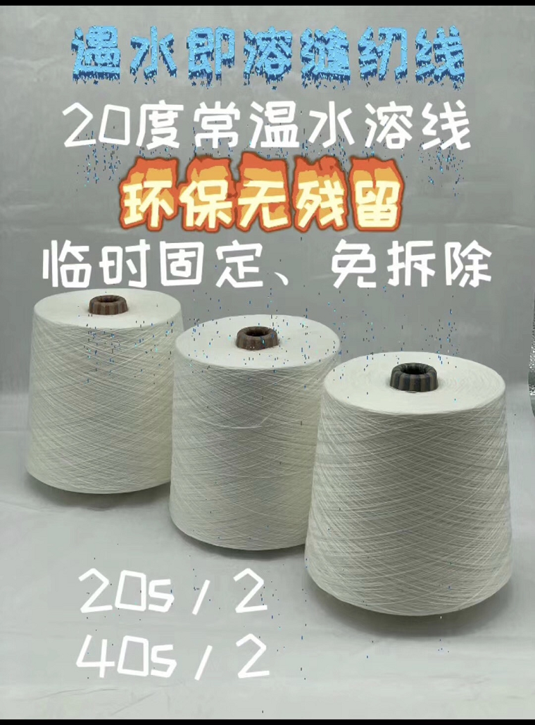 水(shuǐ)溶縫紉線是由短(duǎn)纖維聚乙烯醇(PVA)紡織而成,是為(wèi)了傳統服裝業中疏縫和(hé)臨時(shí)固定而研發。該産品用溫水(shuǐ)浸泡就将會(huì)溶解,免去了人(rén)工拆卸的麻煩,減少(shǎo)人(rén)工拆卸中對面料的損壞,使紡織品表面保持平整。