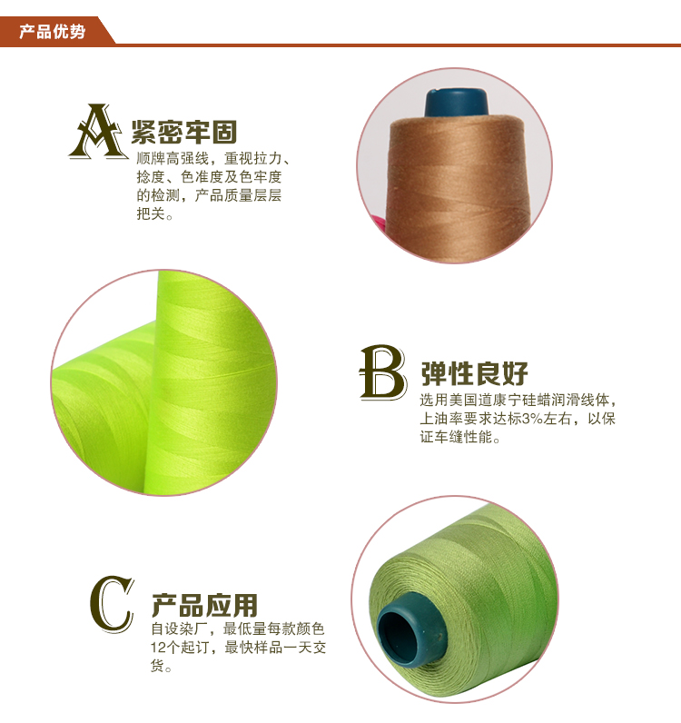 馬克線的優勢:順牌SP線,重視(shì)色準度及色牢度等縫紉線指标的檢測,産品質量層層把關;選用美國道(dào)康甯矽蠟潤滑線體(tǐ),上(shàng)油率要求達标3%左右,以保證車(chē)縫性能;自設染廠,最低(dī)量每款顔色12個(gè)起訂,最快樣品一天交貨