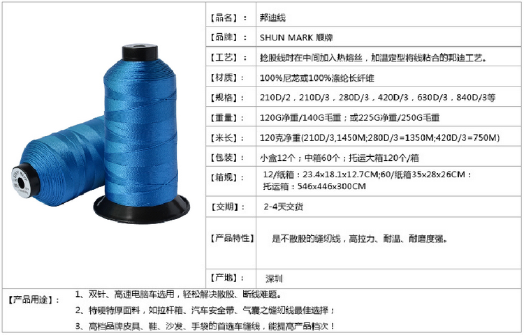 N6邦迪線的工藝:采用純錦綸(尼龍6)長絲合股撚線、粘合定型、染色和(hé)上(shàng)油卷繞等工藝制(zhì)程的縫紉線。按照粘合方式的不同,分為(wèi)內(nèi)邦尼龍邦迪線和(hé)外邦尼龍迪線兩大(dà)類。內(nèi)邦:是通(tōng)過特殊工藝粘合紗線時(shí)直接進行(xíng)內(nèi)部粘合、定型而成。外邦:成品線經過熔化的邦迪膠而達到的外部粘合。