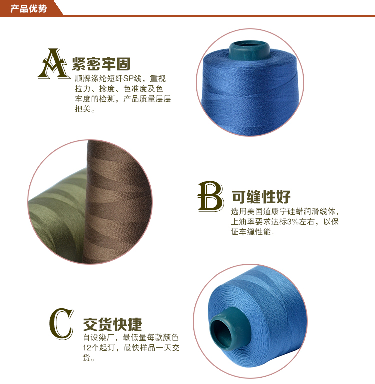 滌綸短(duǎn)纖縫紉線的優勢:順牌SP線,重視(shì)色準度及色牢度等縫紉線指标的檢測,産品質量層層把關;選用美國道(dào)康甯矽蠟潤滑線體(tǐ),上(shàng)油率要求達标3%左右,以保證車(chē)縫性能;自設染廠,最低(dī)量每款顔色12個(gè)起訂,最快樣品一天交貨。