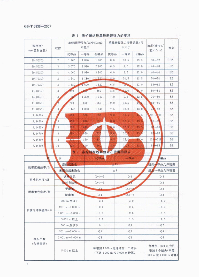 4.2.2  滌綸縫紉線其他內(nèi)在質量的要求見表2。