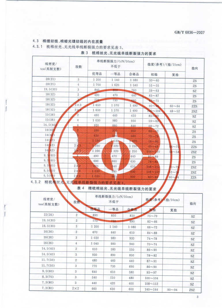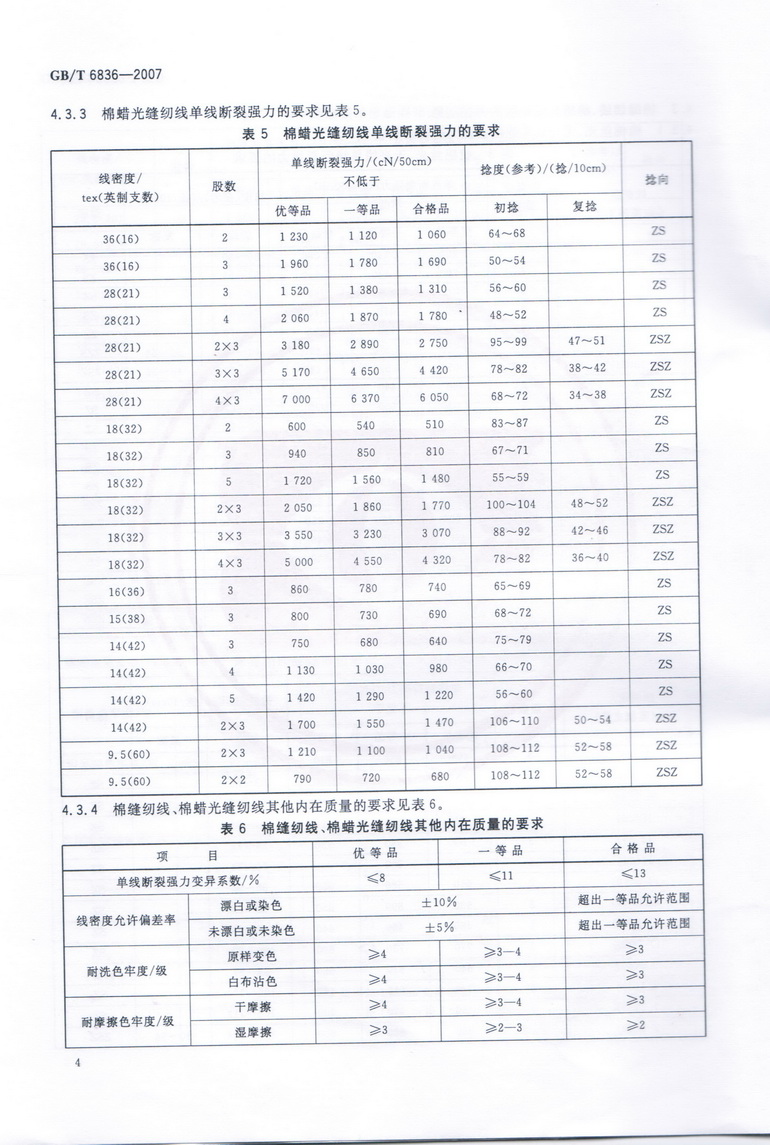 4.1  棉縫紉線、棉蠟光縫紉線、滌綸縫紉線的要求
